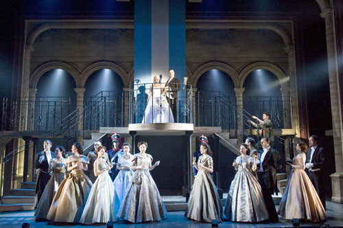 This touring production keeps things simple - grand Moorish arches frame a stripped down set, with cast iron balcony and spiral staircases representing that balcony of the Casa Rosada.
